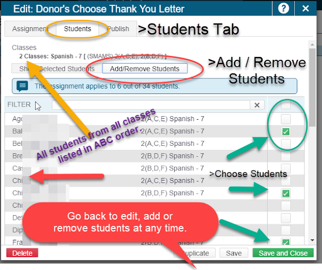 Recently our Spanish classroom got a Donor's Choose project funded. I needed several students to write Thank You letters. I offered this as an optional homework assignment. I made a general announcement in class and as the letters came in I added students to the assignment in PowerSchool. I really enjoyed the ability to list students from mutiple class sections and choose from an alphabetical list.